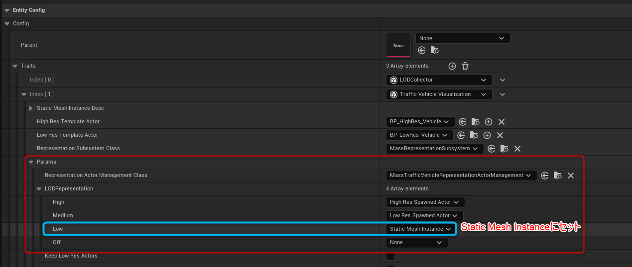 [Traits -> Index[1] -> Params -> LOD Representation -> Low]を[Static Mesh Instance]にセットする